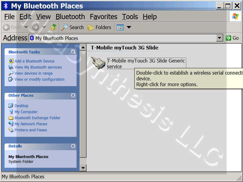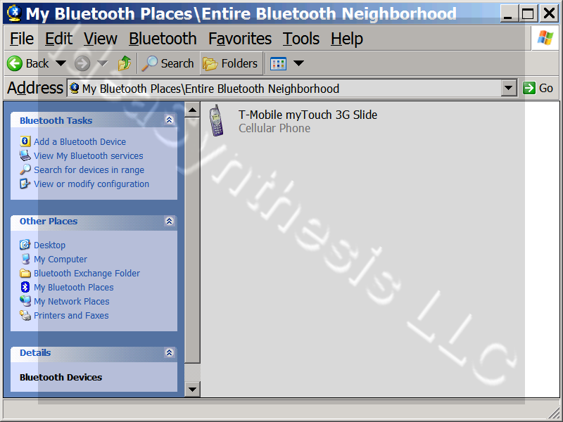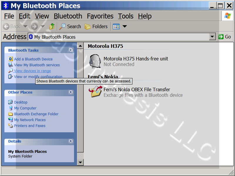 On the Thinkpad, double click on the Bluetooth icon in the system tray to open up the My Bluetooth Places explorer window as shown in Figure 9 below.
