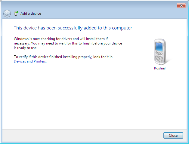 Once the pairing is complete a confirmation will be displayed on the Windows 7 computer as shown in Figure 13 below. Click the Close button.
