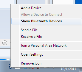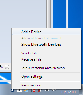 On the Windows 7 computer, click on the Bluetooth icon in the system tray to open up the Bluetooth Devices menu as shown in Figure 9 below, and then select Add a Device.