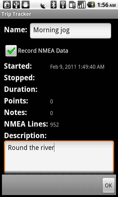 The trip details view will let you set a name and a description for the trip as shown in Figure 10 below. You may also disable the option to record NMEA data: this is enabled by default. If you wish to export the data through SolidSync Network/Bluetooth GPS, do not clear this option. If you want to export to KML only, you can uncheck this. Once this setting is cleared it cannot be re-enabled.