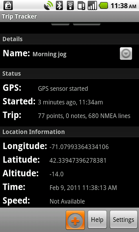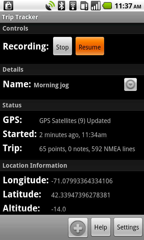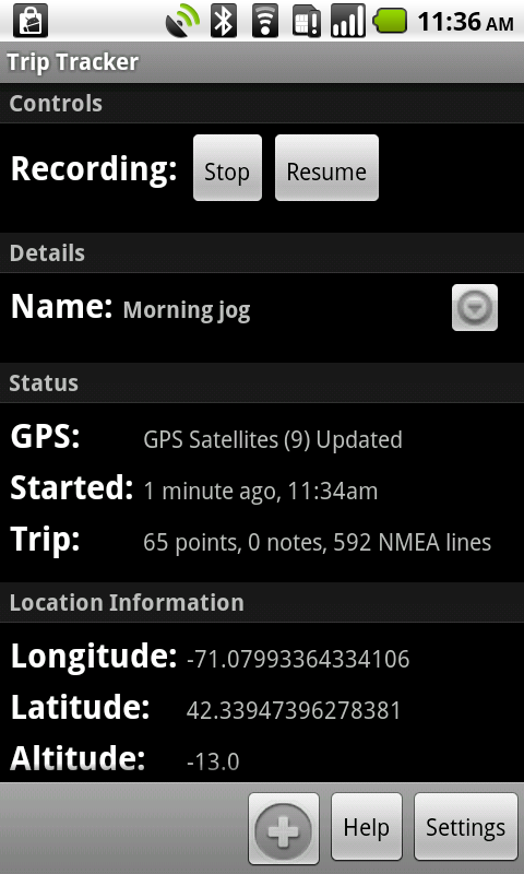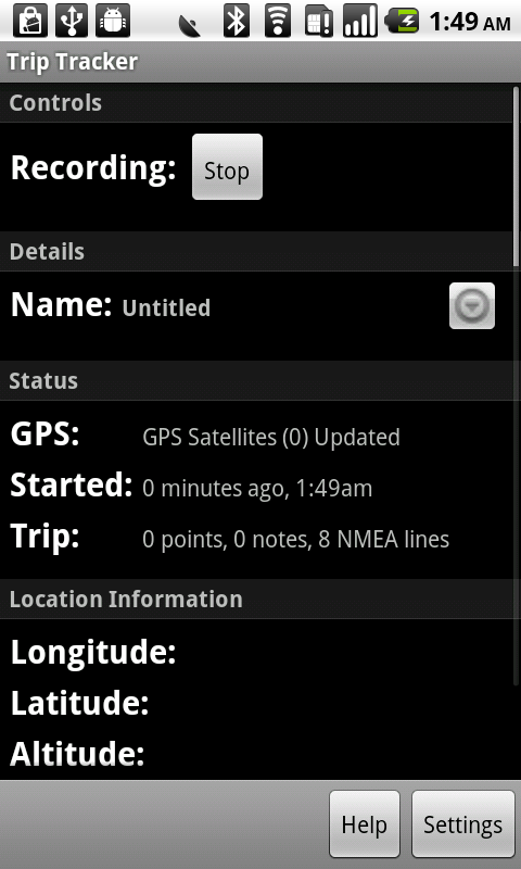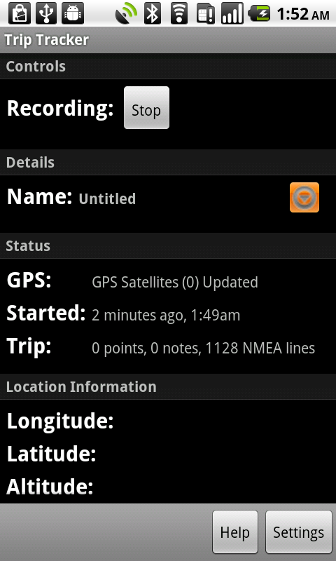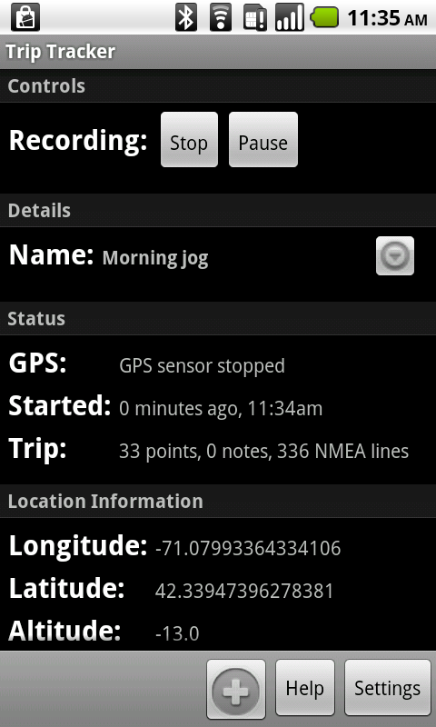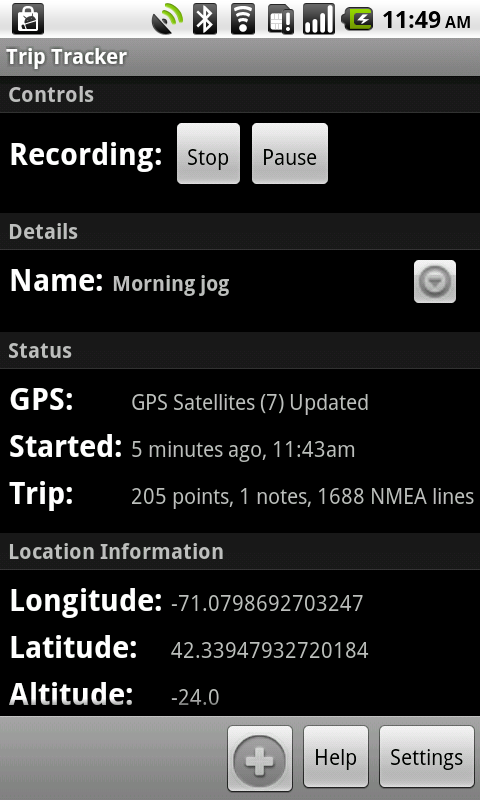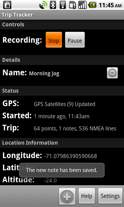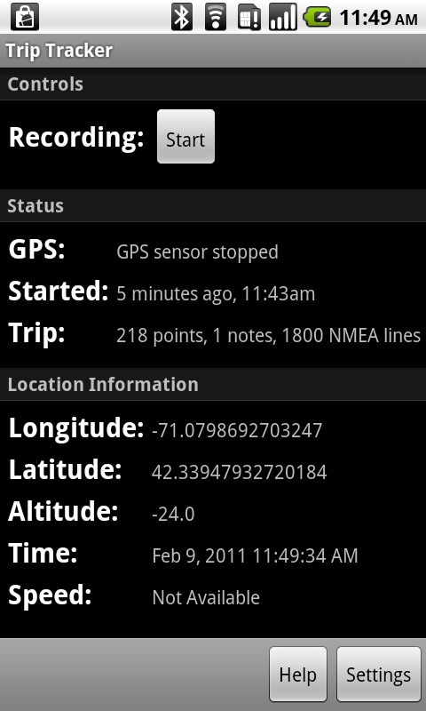Tap OK to save your changes and return to the main application screen. As data is recorded the screen will update to show you the status of the recording. Once a GPS fix is obtained, the location details will be shown as in Figure 11 below.