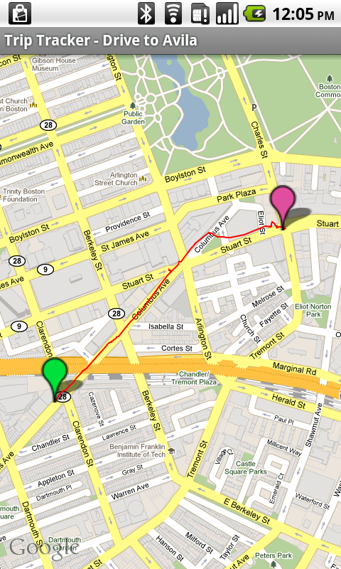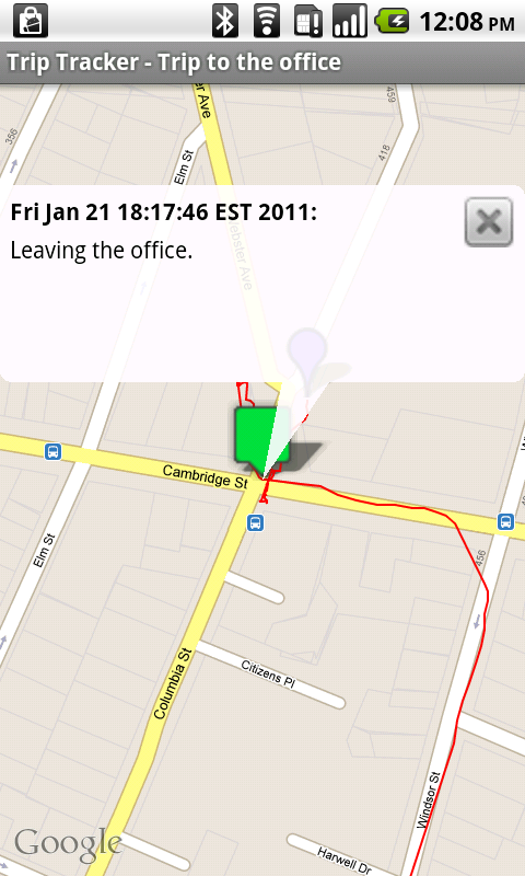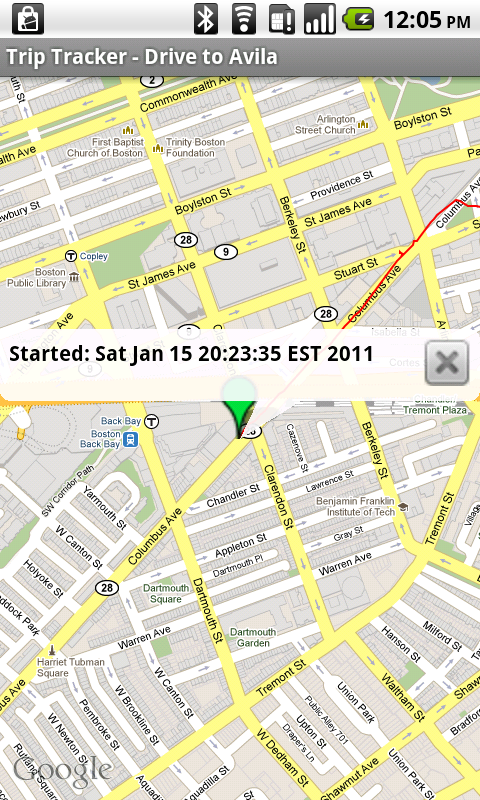 The map will show colored markers for the start and end of the trip: tapping any of the markers will center the map on that marker and show the relevant information for that marker, as seen in Figure 25 below.