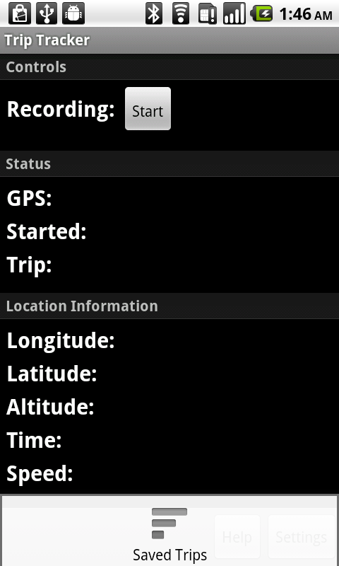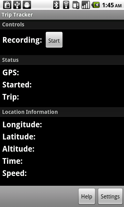 Tap the OK button to show the main application screen as in Figure 3 below: it includes the recording control button, status indicators and location details.