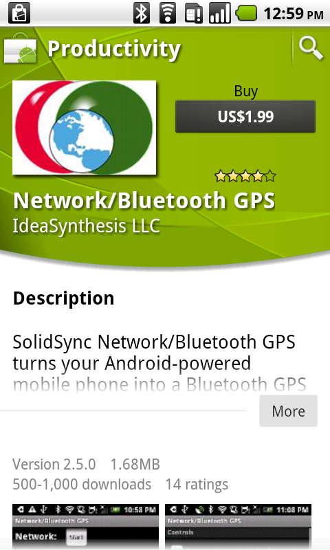 If SolidSync Network/Bluetooth GPS is not installed then the Android Market page for SolidSync Network/Bluetooth GPS will be shown as seen in Figure 37 below.